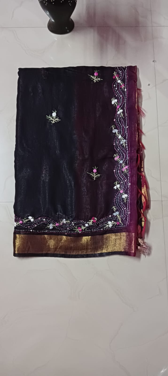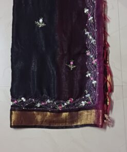 The highlight of this saree is its exquisite Lambani embroidery – a bold, vibrant, and intricate stitchwork technique perfected by the Lambani (Banjara) community, a nomadic tribe celebrated for their colorful artistry. Each saree comes alive with vivid threadwork, geometric motifs, and traditional mirror embellishments, giving it a festive sparkle and a distinct cultural identity.
