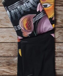 The highlight of this masterpiece is the hand-printed Ganesh motif, symbolizing wisdom, prosperity, and auspicious beginnings. Set against a striking black base, the design beautifully contrasts to create a look that is both devotional and fashionable.